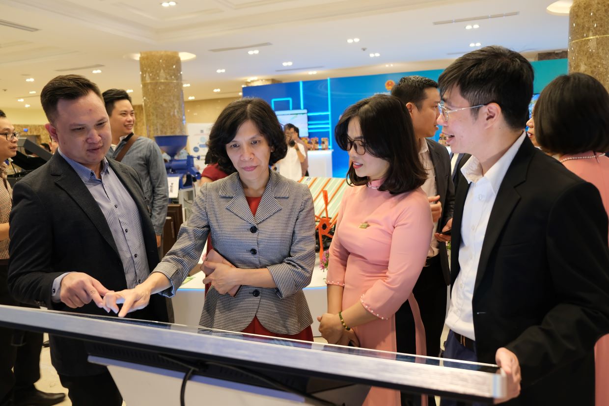Phó Cục trưởng Cục TMĐT và Kinh tế số Lại Việt Anh (thứ 2, từ trái sang) tham quan và trải nghiệm về hệ sinh thái hỗ trợ doanh nghiệp chuyển đổi số